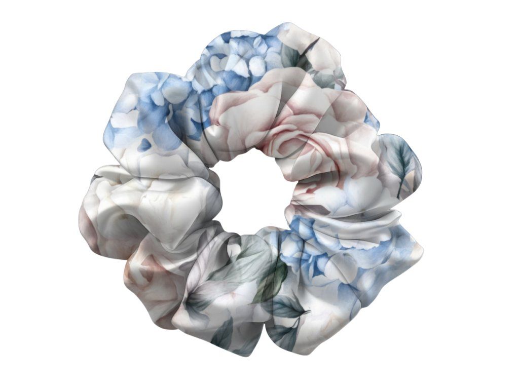 Lehký pastelový vzor v kombinaci modré a růžové dodává této saténové scrunchie svěží a romantický vzhled. Vyrobeno ručně v limitovaném počtu 11 kusů.