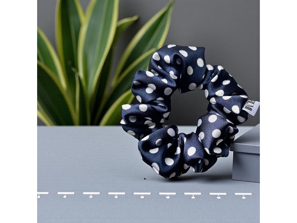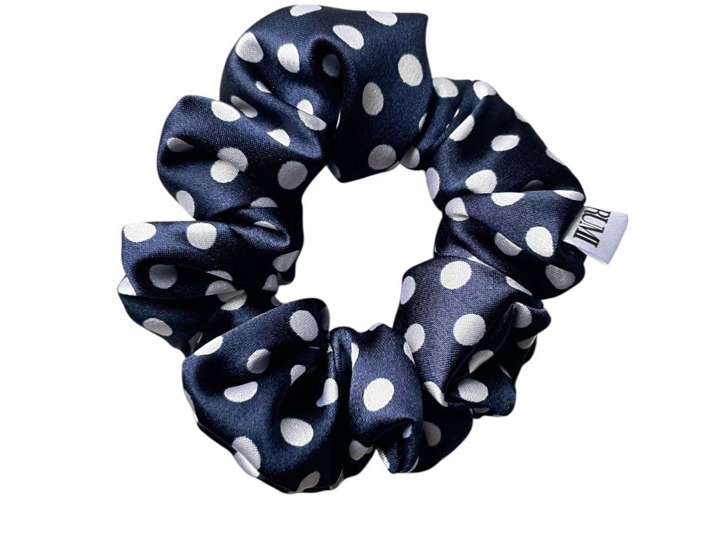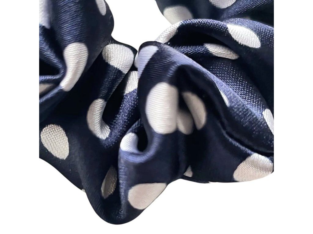 Dodej svému účesu nádech retro elegance s touto tmavě modrou scrunchie s výraznějšími puntíky.