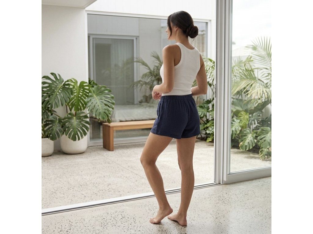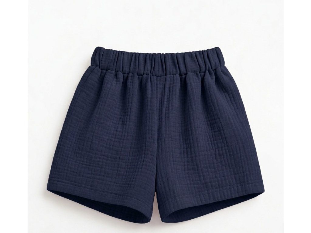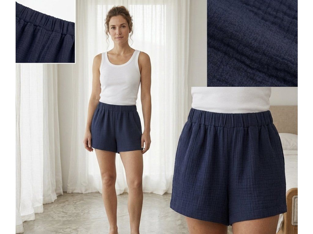 Ponořte se do hlubokého klidu noční oblohy. Tyto mušelínové kraťasy v intenzivním odstínu půlnoční modři jsou stvořeny pro dokonalou relaxaci a nerušený spánek. Jsou lehké jako vánek, neuvěřitelně jemné a přirozeně prodyšné – prostě kousek poctivé ruční práce, který si zamilujete od prvního oblečení.