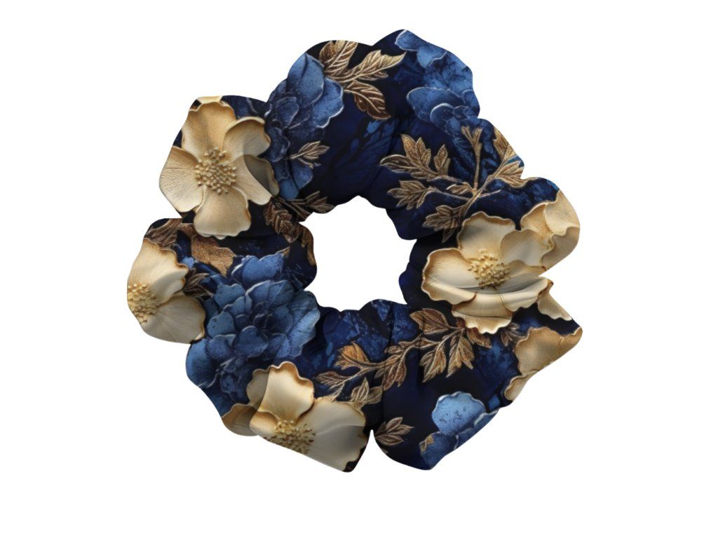 Elegantní saténová gumička s hlubokým modrým základem a zlatavými odlesky, která do vašeho účesu vnese kouzlo noční přírody.